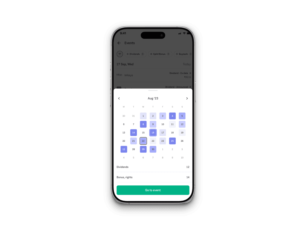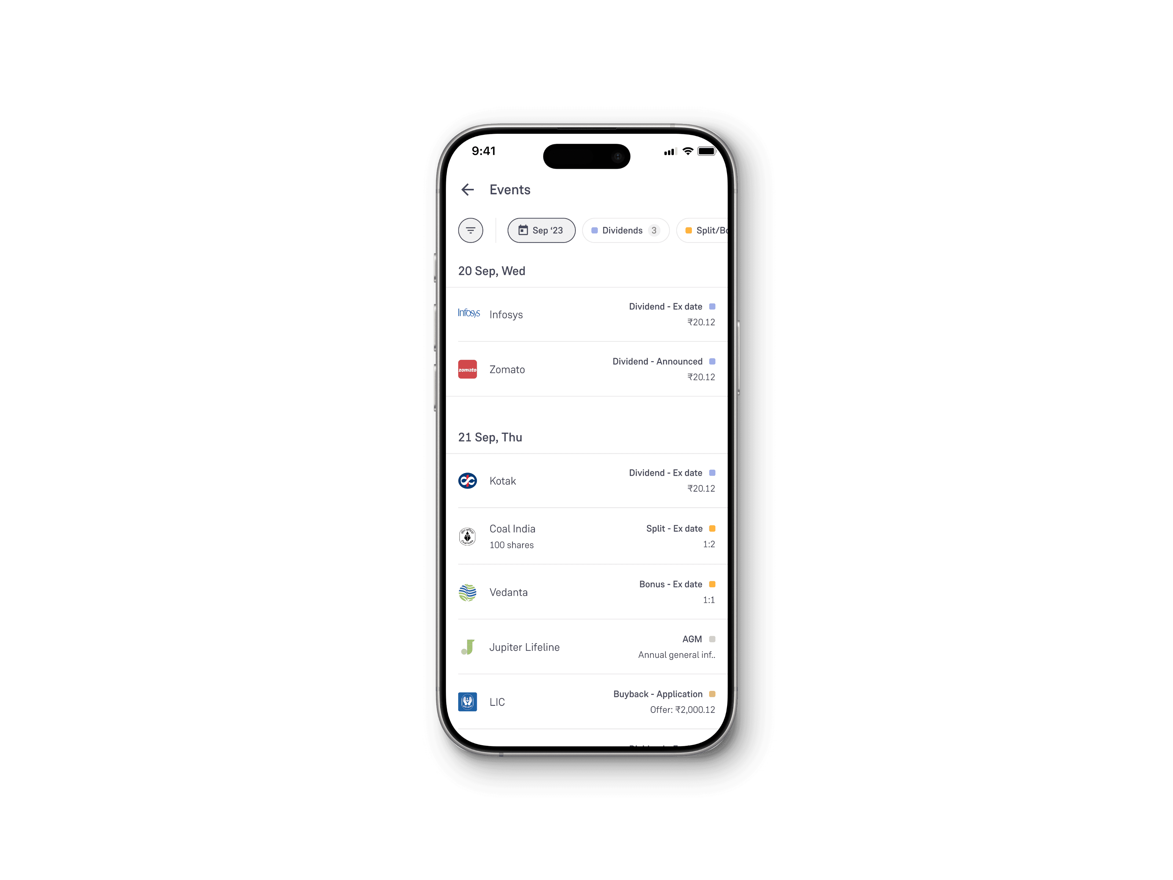 I centered the interface on fast glances: dates are visually prominent, events are color-coded, and one-tap filters surface the most-used actions—dividends, bonuses, splits. Users can scan the coming week or switch to a full-month view for broader context.