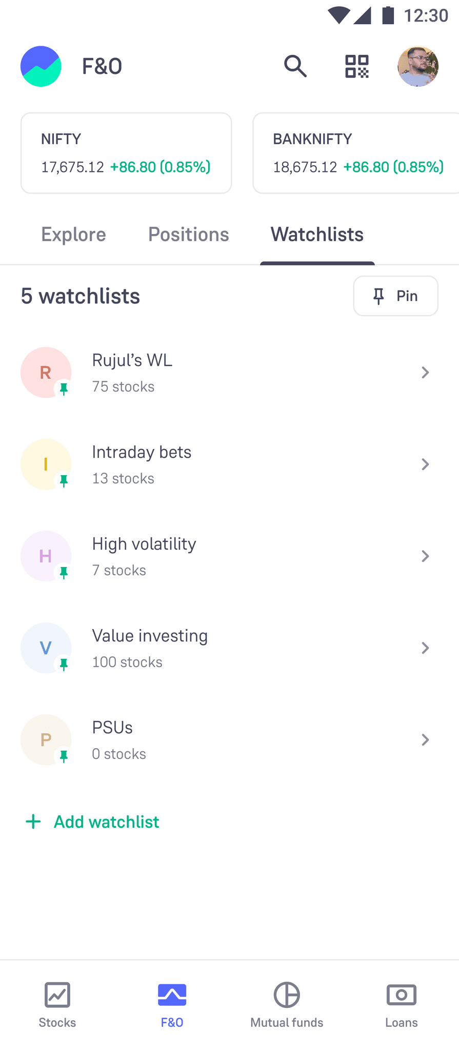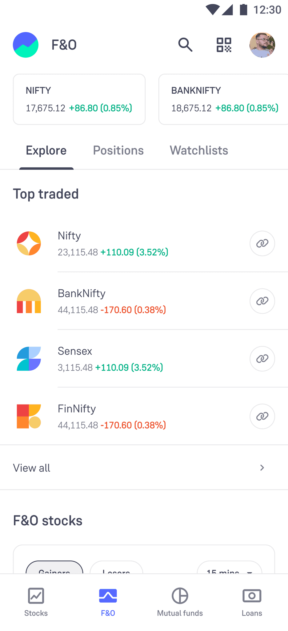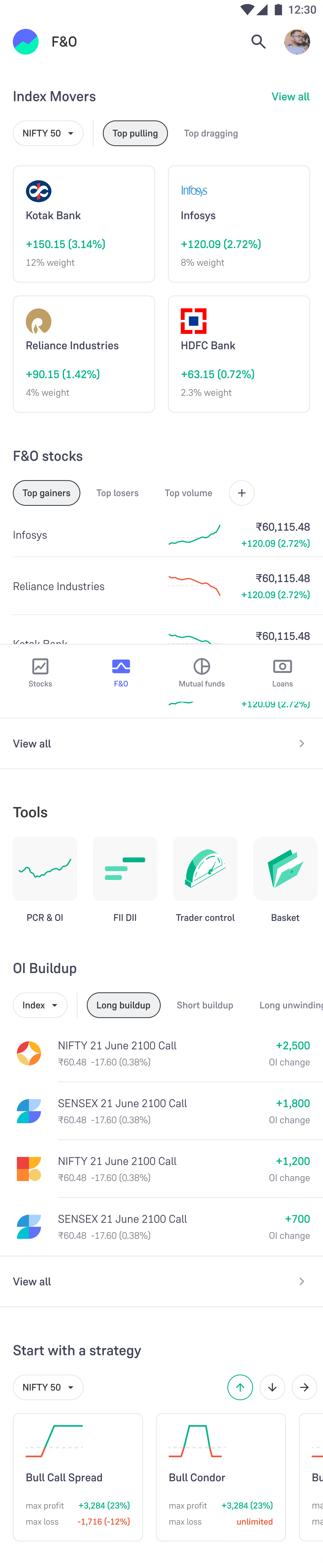 We moved out F&O as a seperate tab from stocks, which proposed navigational challenges. Change management & delightfully presenting all that they require from an F&O home was the key challenge here. Boiled down to three important pages, Explore - to check widgets, Watchlist - to add contracts to shortlist, Positions - to check P&L after taking a position